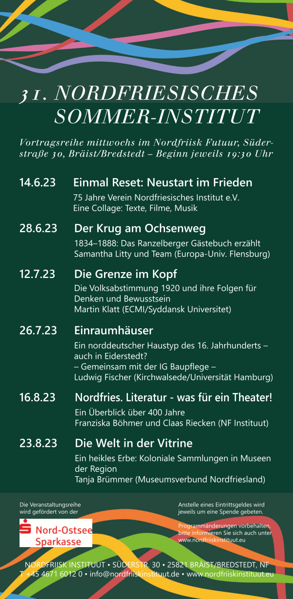 Das 31. Programm unserer Vortragsreihe, des Sommerinstitutes ist fertig. Wir freuen uns auf viele spannende Begegungen hier im Nordfriisk Instituut! Und auf viele gute Gespräche nach den Vorträgen bei einem guten Glas Wein oder anderen Getränken auf unserer Terrasse.