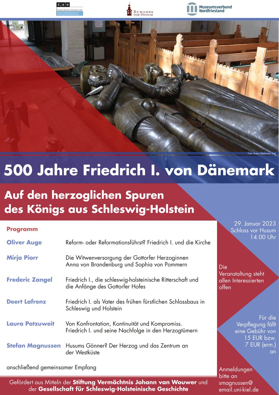 Am 29. Januar 1523 – vor genau 500 Jahren - wurde Herzog Friedrich I. von Schleswig und Holstein (1471–1533) in Husum die dänische Krone angeboten. So kennt man ihn heute auch vor allem als dänisch-norwegischen König. Mit 43 Jahren war er aber auch einer der dienstältesten Herzöge von Schleswig und Holstein. Doch auch wenn er heute der einzige in Schleswig-Holstein bestattete dänische König ist, war das historische Interesse an Friedrich I. bislang eher gering. Dabei hatte seine Regentschaft einen maßgeblichen Einfluss auf die weitere Geschichte des Landes.