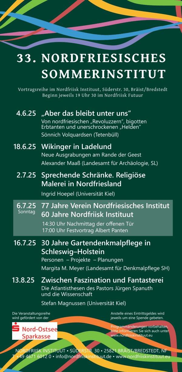 Die Reihe Sommerinstitut findet 14tägig statt und wird unterstützt von der Nord-Ostsee Sparkasse. Weitere Vorträge widmen sich unter anderem archäologischen Ausgrabungen in Ladelund, Schränken, die mit religiösen Motiven bemalt wurden, historischen Gärten sowie den Atlantisthesen des Pastors Jürgen Spanuth. Das vollständige Programm finden Sie u.a. hier.