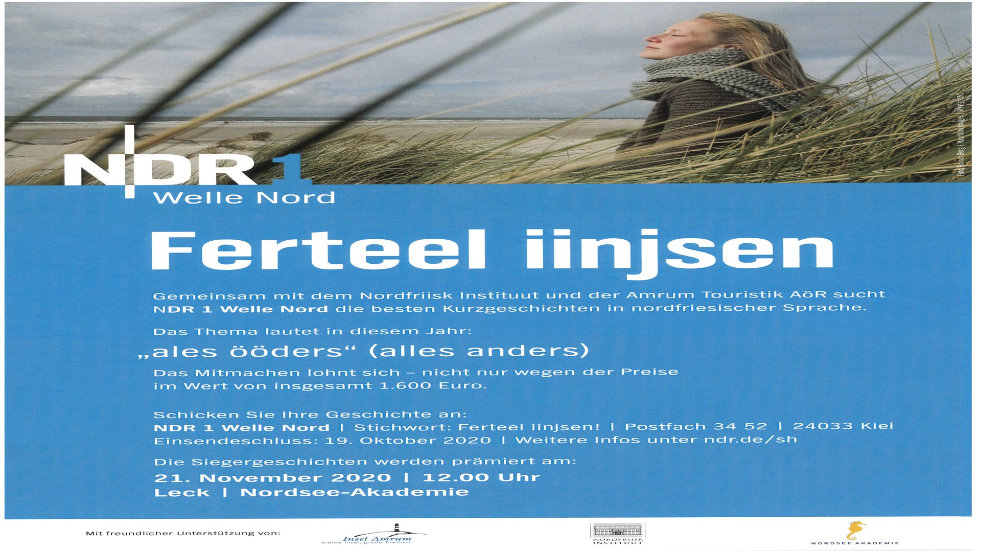 Zum elften Mal suchen das Nordfriisk Instituut und die NDR 1 Welle Nord mit Unterstützung der Amrum Touristik AöR die besten Kurzgeschichten in nordfriesischer Sprache. Beiträge sind in allen nordfriesischen Mundarten sind willkommen. Der Text sollte nicht länger sein als zwei Seiten in normaler Maschinenschrift. Mit etwas Glück kann sich der Einsatz sogar richtig lohnen: Es winken Preise im Wert von 1.600 Euro.
