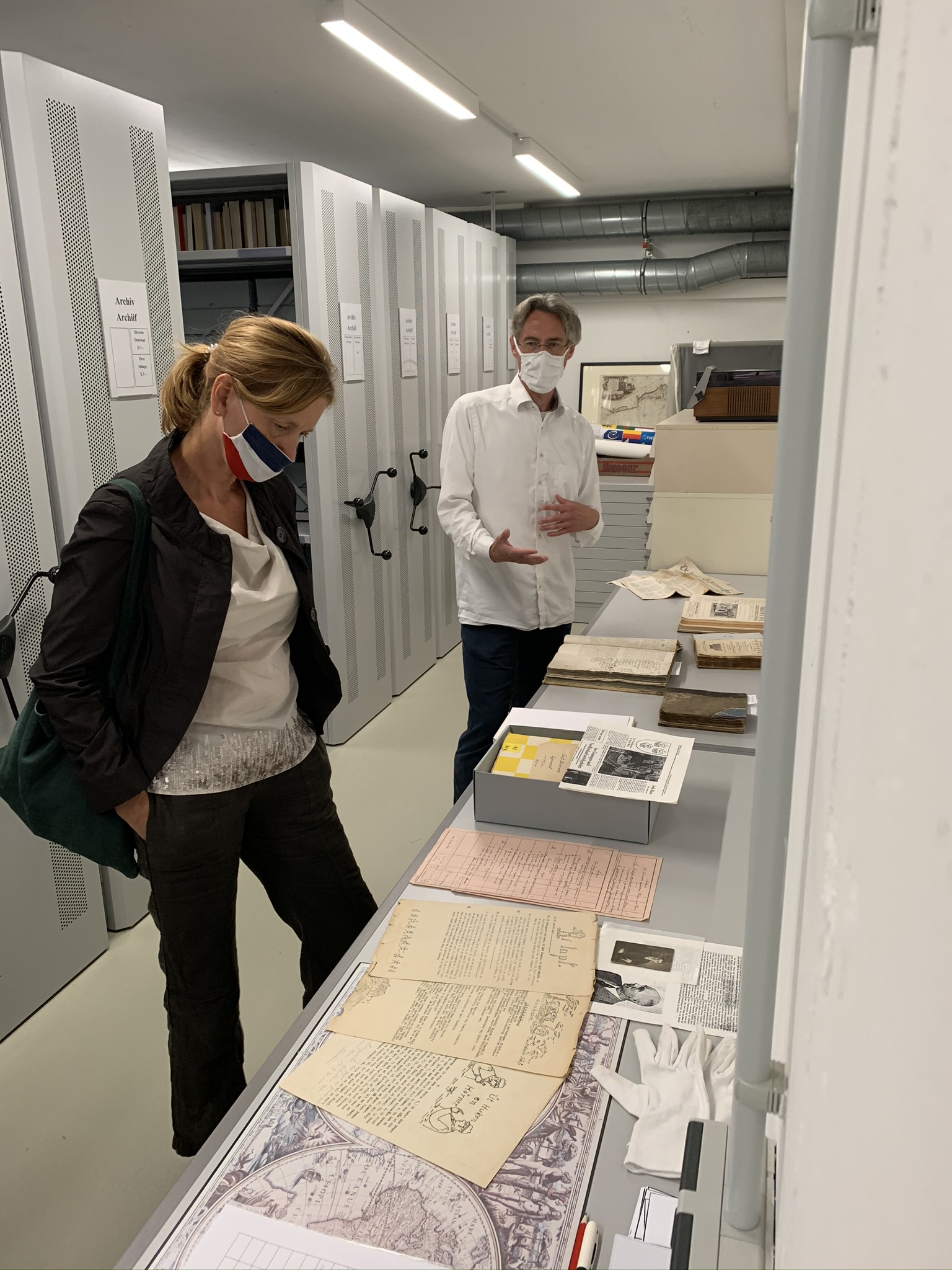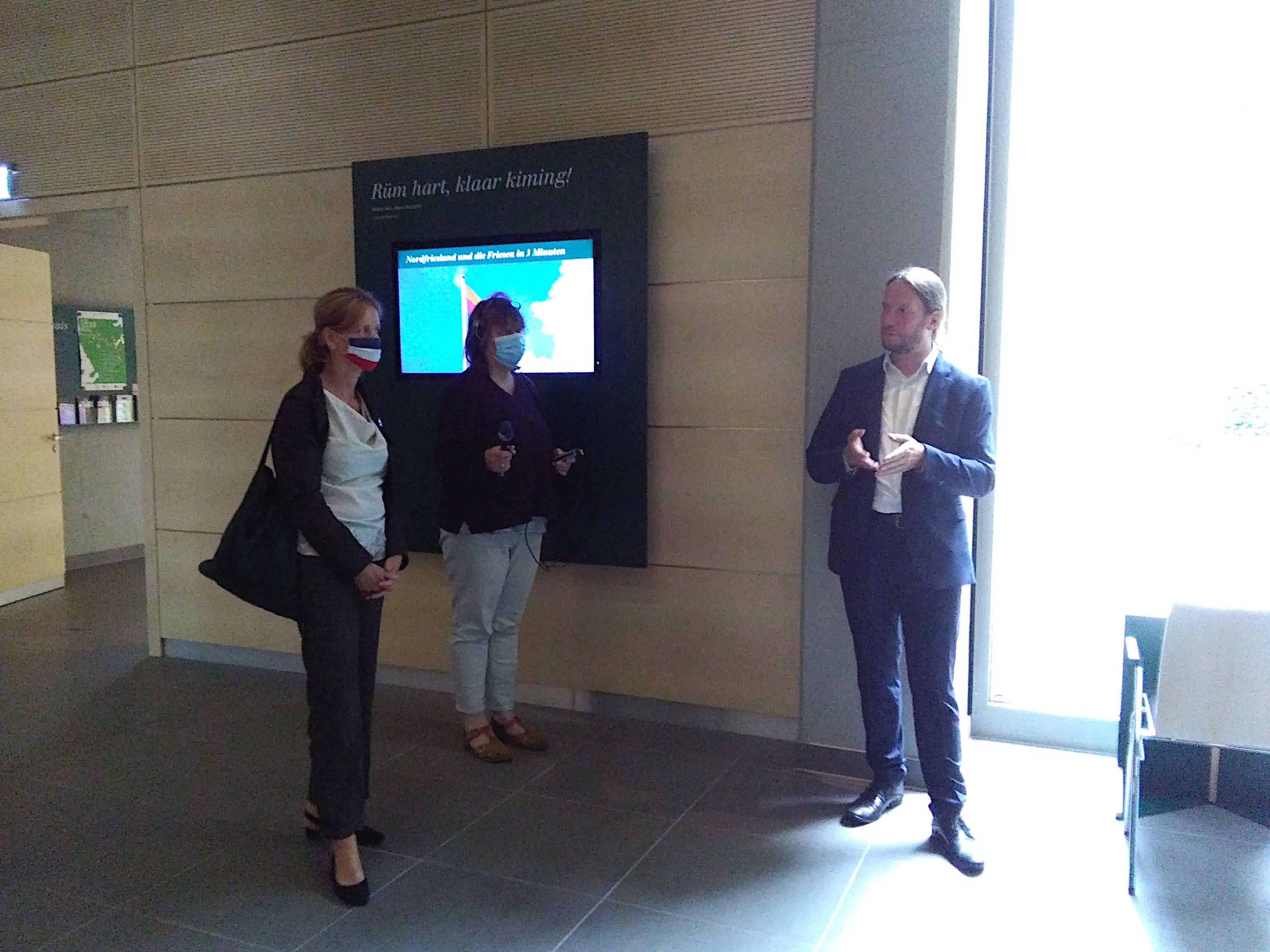 Anschließend besichtigte Karin Prien das Nordfriisk Futuur. Nachdrücklich interessiert zeigte sie sich an der Migrationsgeschichte und Wirtschaftskompetenz der frühen Friesen; und gar nicht lange ließ sich die Ministerin überreden, an der Karaoke-Station selber einmal Friesisch zu sprechen. Sie sei beeindruckt, wie gekonnt diese Ausstellung als außerschulischer Lernort konzipiert sei und verwies darauf, dass heimatkundliche Themen im Sachunterricht bei der aktuellen Neuregelung besondere Berücksichtigung fänden – eine gute Nachricht für die Zusammenarbeit mit Schulen in der Region, waren sich Gäste und Gastgeber einig. Bibliothekar Harald Wolbersen zeigte anschließend kurz das klimatisierte Magazin, das, so Christoph Schmidt, für die Arbeit des Institutes mindestens ebenso wertvoll sei wie die neue Ausstellung. Besondere Aufmerksamkeit fanden bei der Ministerin rund neunzig Jahre alte, illustrierte Unterrichtsblätter aus der Hand des Lehrers, Autors und Sprachforschers Albrecht Johannsen. Harald Wolbersen betonte, wie wichtig es vielen Friesen sei, für Ihre Nachlässe einen passenden Ort zu wissen, der dem Anspruch friesischer Identität gerecht würde.