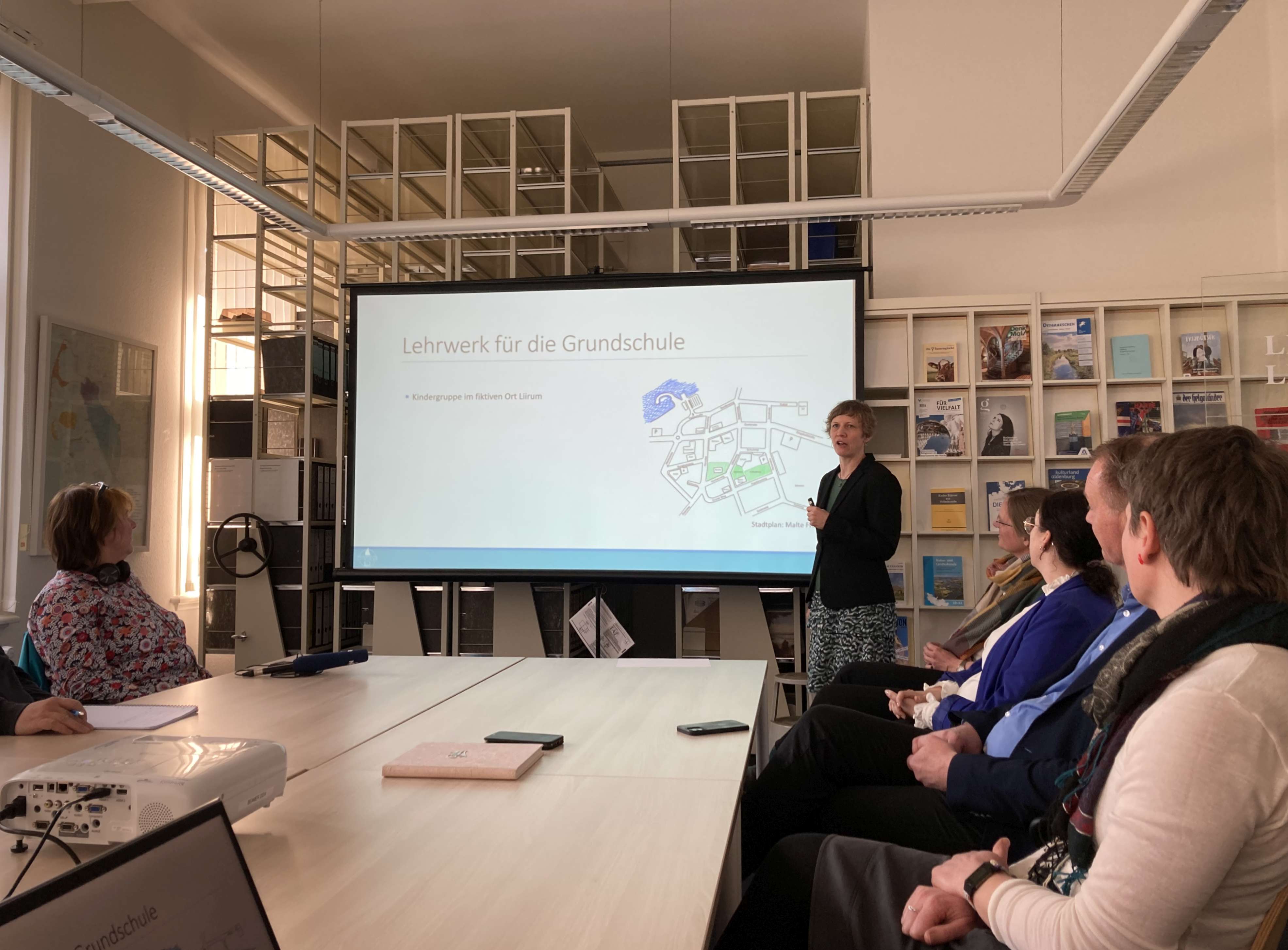 Lena Terhart, Abteilungsleiterin der Nordfriisk Liirskap am Institut, erläuterte das Konzept für das Grundschullehrwerk, das im Entstehen sei, den neuen Onlinesprachkurs und den Plan, die Weitergabe von Sprachen durch Großeltern an ihre Enkel zu erforschen, um so Wege zu finden, wie die nordfriesische Sprache auch in der Familie gestärkt werden kann.