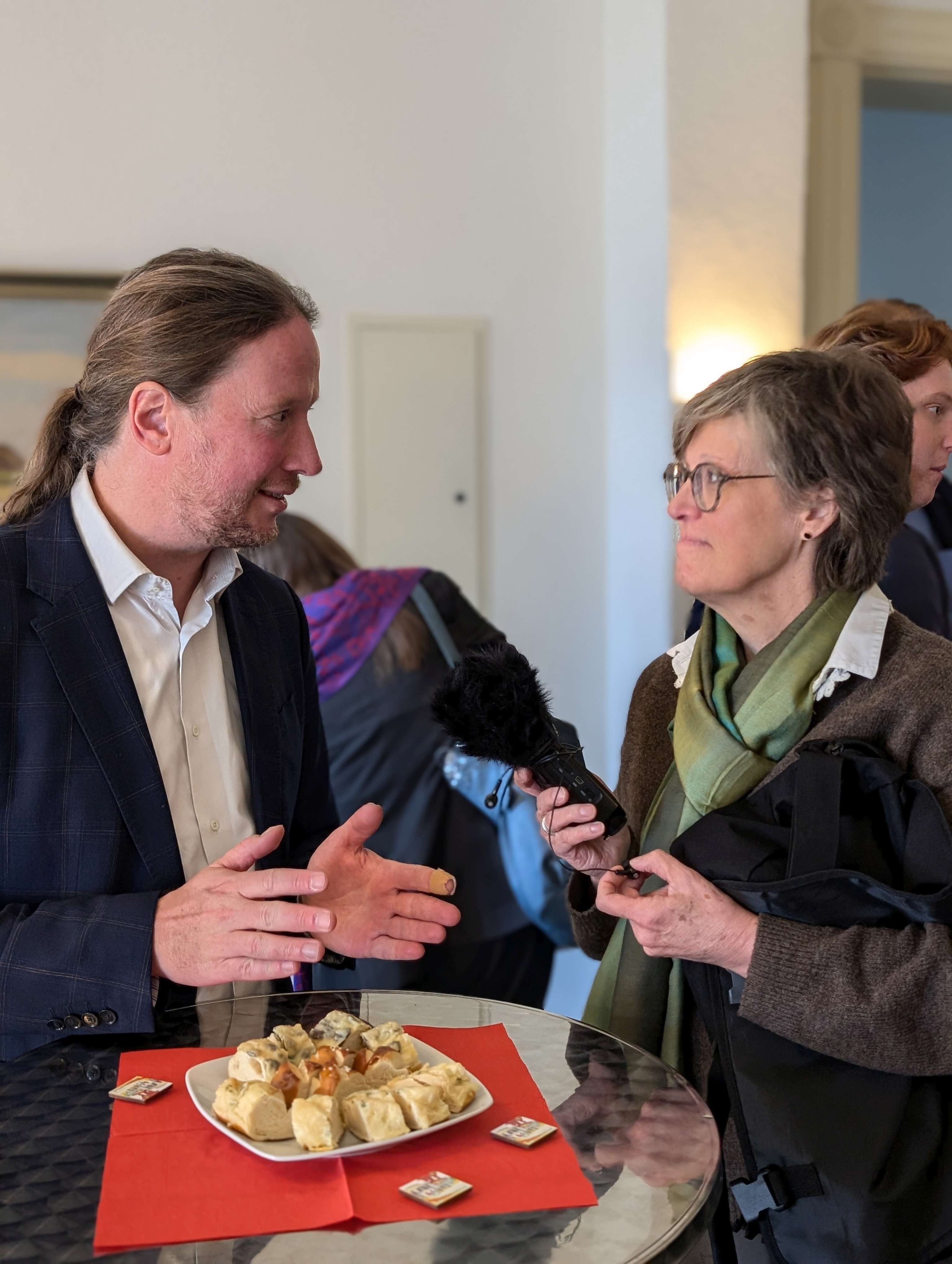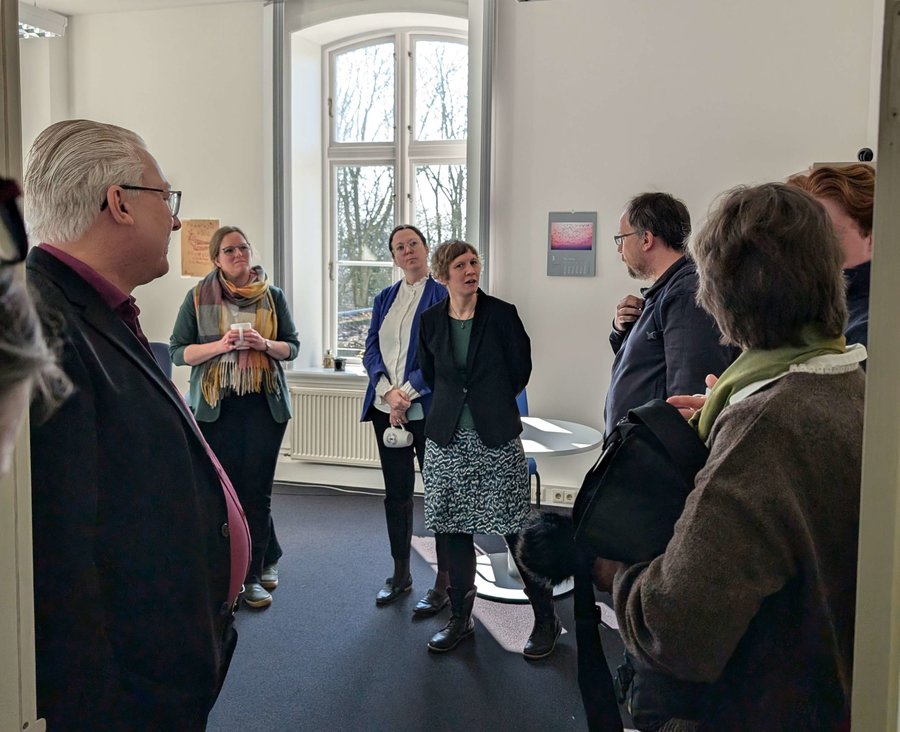 Der Minderheitenbeauftragte des Ministerpräsidenten, Johannes Callsen, würdigte im Rahmen der kleinen Feier die hochwertige Arbeit des Institutes: Für die Erforschung und Vermittlung von friesischer Sprache und Kultur sei dieses Haus die Hauptanlaufstelle und unverzichtbar geworden; der Aufbau der Nordfriisk Liirskap sei hierbei ein neuer Meilenstein. Sybilla Nitsch, Landtagsabgeordnete und Mitglied im Stiftungsrat der Friisk Stifting, unterstrich, dass die Unterstützung gerade der Friesen in Schleswig-Holstein keine politische Nische sei, sondern fraktionsübergreifend breite Unterstützung finde; dies sei eine wichtige und ermutigende Beobachtung. Institutsdirektor Christoph G. Schmidt bedankte sich herzlich: „Die verlässliche Förderung erlaubt es uns einerseits, uns auf die inhaltliche Arbeit zu konzentrieren, und andererseits, gute Mitarbeiterinnen und Mitarbeiter nicht nur zu gewinnen, sondern auch zu halten.“ Die neuen Mittel für die Spracharbeit im Rahmen der Nordfriisk Liirskap seien nicht nur für das Institut, sondern für die friesische Volksgruppe insgesamt ein Fortschritt, wie es ihn seit Jahrzehnten nicht gegeben habe – hier würden Dinge möglich, wie sie seit Langem schon Wunsch und auch Erwartung gewesen seien, aber bisher nicht umsetzbar waren. Anschaulich zeigte er in einer Grafik, wie die Belegschaft des Institutes innerhalb der letzten 16 Monate deutlich größer geworden ist.