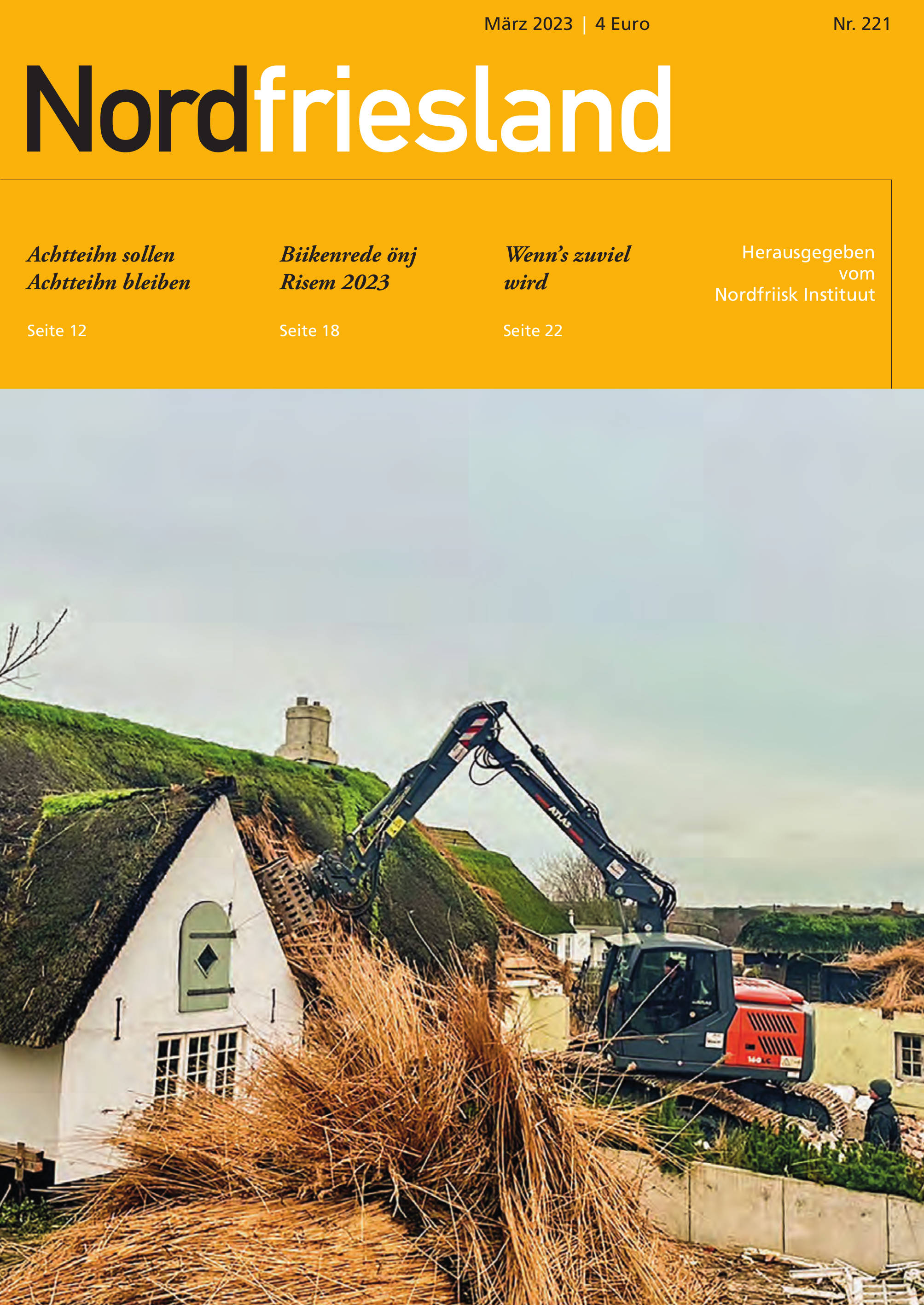 Aktuelle Berichte, etwa zur derzeitigen Abrisswelle historischer Häuser in Nordfriesland, und Buchhinweise runden „Nordfriesland“ 221 ab. Das Heft umfasst 32 Seiten, kostet 4,00 Euro und ist erhältlich über den Buchhandel oder direkt beim Nordfriisk Instituut. Mitglieder des Vereins Nordfriesisches Institut und der Friisk Foriining erhalten ihr Exemplar kostenlos zugeschickt.