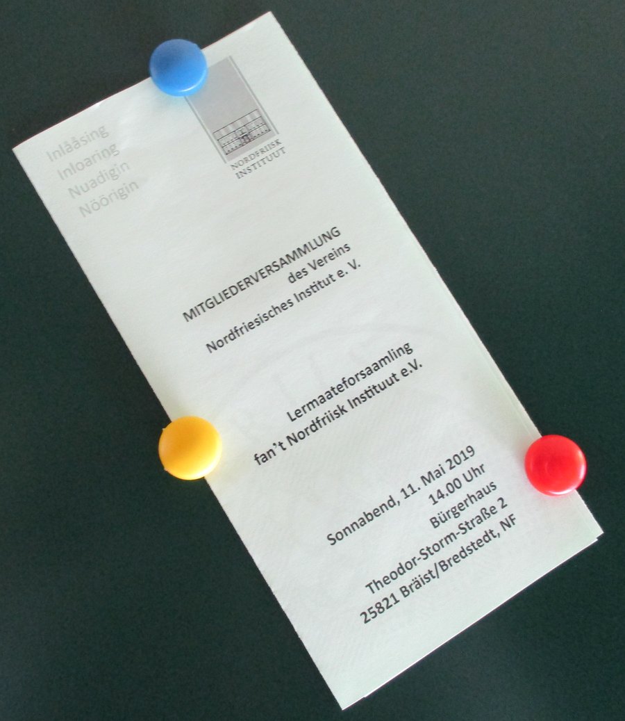 Der Verein Nordfriesisches Institut kommt am Sonnabend, 11. Mai, um 14 Uhr im Bredstedter Bürgerhaus, Theodor-Storm-Str. 2, zu seiner Mitgliederversammlung 2019 zusammen. Die Vorsitzende Inken Völpel-Krohn wird den Jahresbericht des Vereins abgeben. Für den Jahresbericht des Instituts zeichnet Institutsdirektor Dr. Christoph Schmidt verantwortlich. Mit Spannung erwartet wird auch sein Vortrag über die Entdeckung einer altgermanischen Inschrift, die ungeahnte Folgen hatte. Weiterhin stehen der Haushaltsplan 2019 und eine Satzungsänderung auf der Tagesordnung. Gäste sind herzlich willkommen. Zu der Versammlung wird um Anmeldung im Institut gebeten: Telefon 04671 6012-0, E-Mail: info(at)nordfriiskinstituut.de.