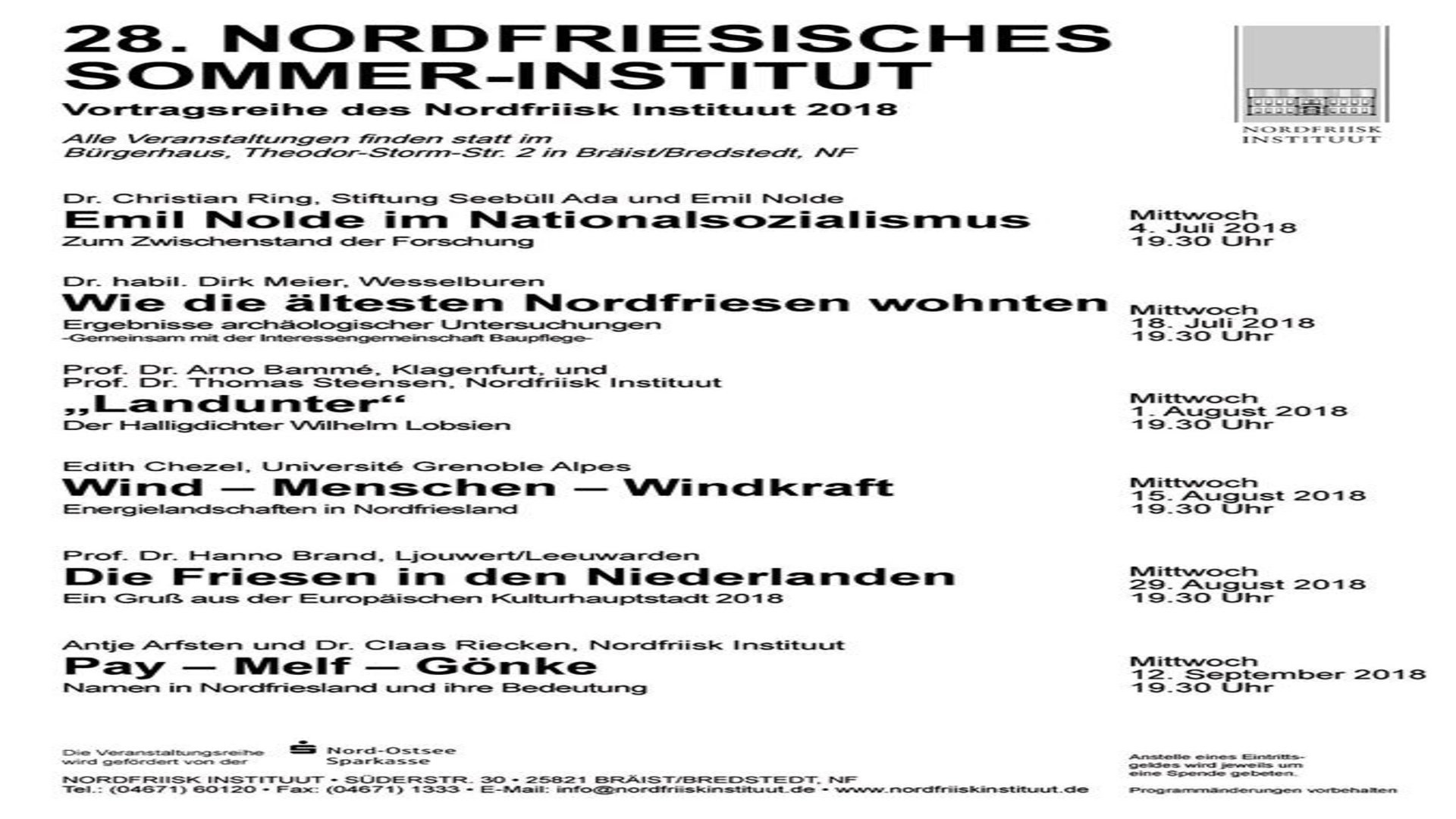 „Die Friesen in den Niederlanden“ werden von Prof. Dr. Hanno Brand aus der westfriesischen Provinzhauptstadt Ljouwert/Leeuwarden am 29. August erklärt. Ljouwert ist Europäische Kulturhauptstadt 2018 und Brandts Vortrag ein Gruß aus dieser einzigen friesischen Großstadt mit ihren über 100 000 Einwohnern.