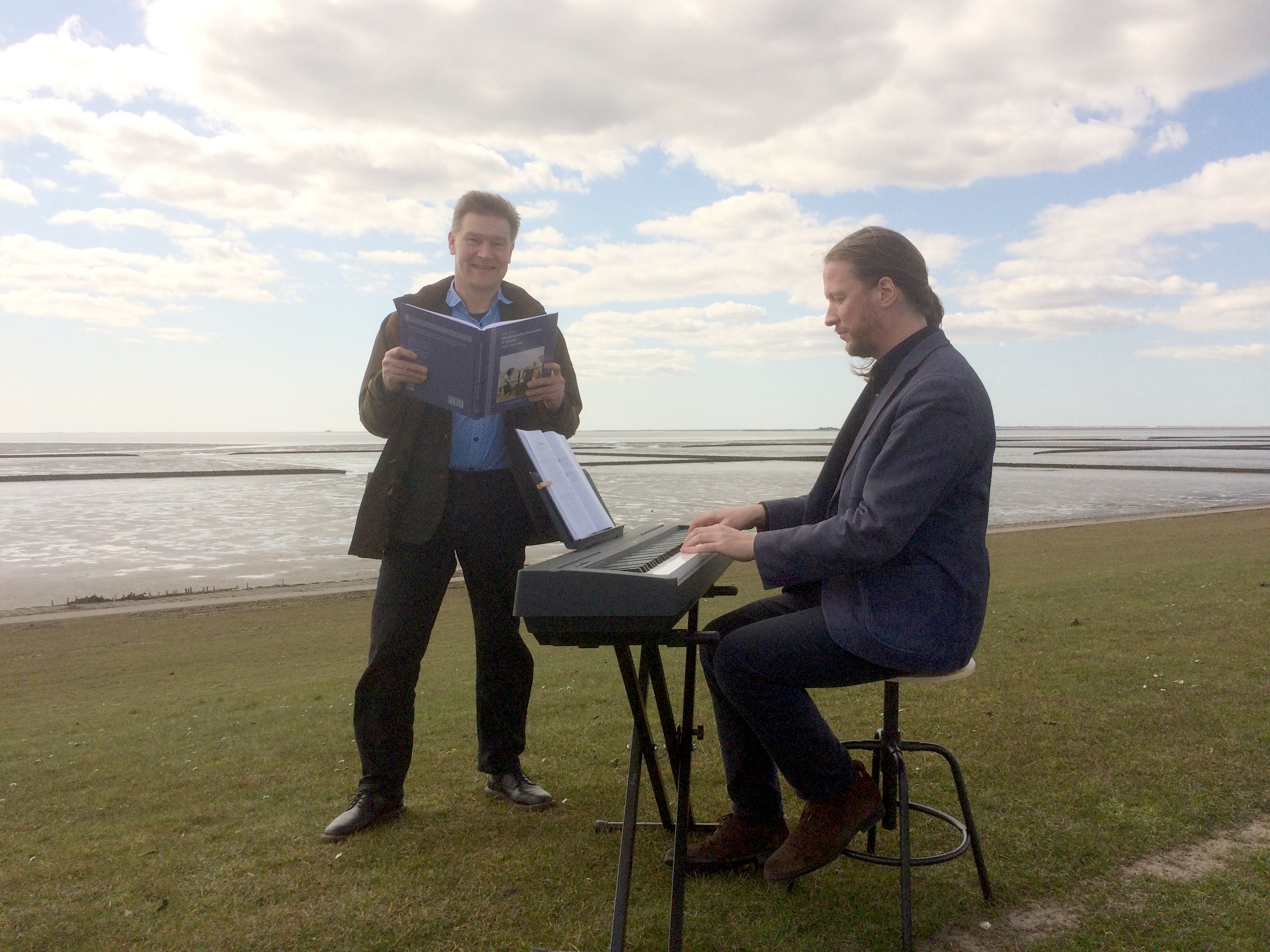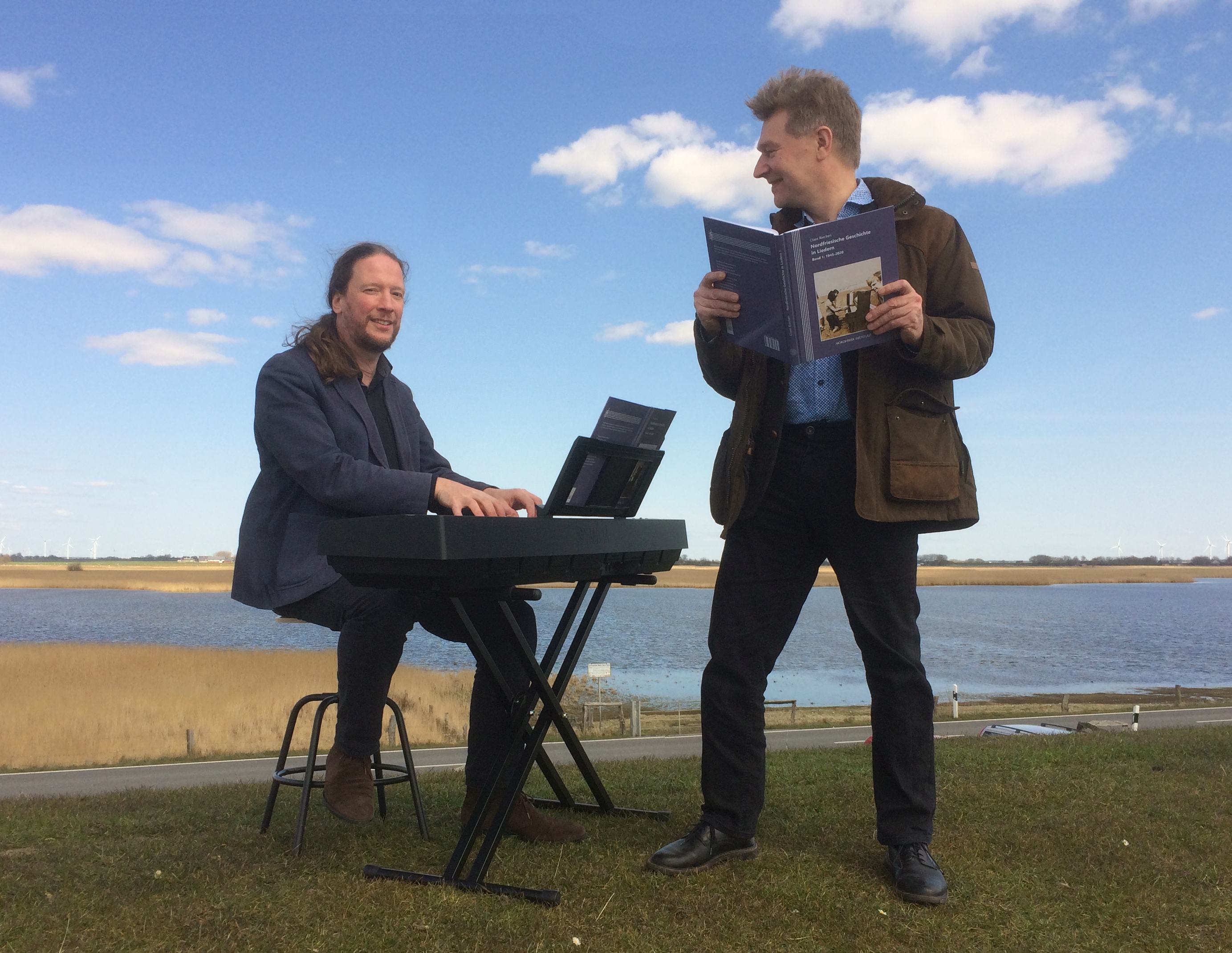 Das neue Buch des Nordfriisk Instituut erzählt anhand von Liedern nordfriesische Geschichte nach 1945. Autor Claas Riecken (links) und Institutsdirektor Christoph G. Schmidt präsentieren es pandemiekonform ohne Publikum auf dem Deich bei Schlüttsiel (Fotos: Franziska Böhmer).