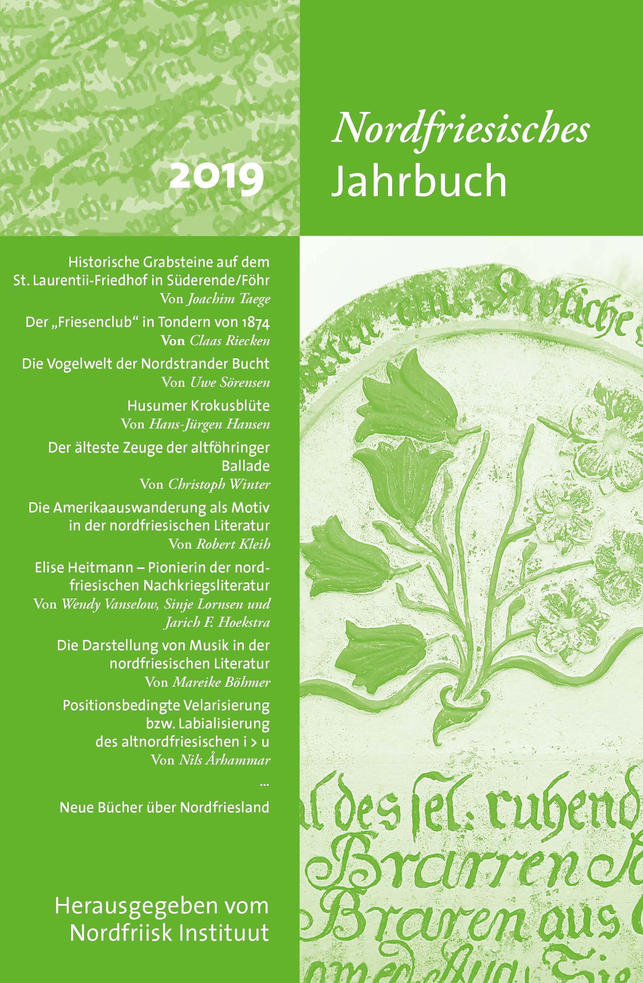 Vielfältig sind die Themen im Nordfriesischen Jahrbuch 2019, das soeben im Nordfriisk Instituut erschienen ist. Die Interessen der Forscher bewegen sich zwischen Geschichte, Literatur, Sprache und Naturwissenschaft. Albert Panten stellt einen Reisebericht aus dem 18. Jahrhundert vor, Joachim Taege beschäftigt sich eingehend mit den historischen Grabsteinen auf dem St. Laurentii-Friedhof in Süderende auf Föhr. Dr. Claas Riecken hat sich auf die Suche nach Spuren des „Friesenclubs“ in Tondern von 1874 gemacht, während Sönnich Volquardsen ein verlorenes Tagebuch vom Ruttebüller See wiedergibt.