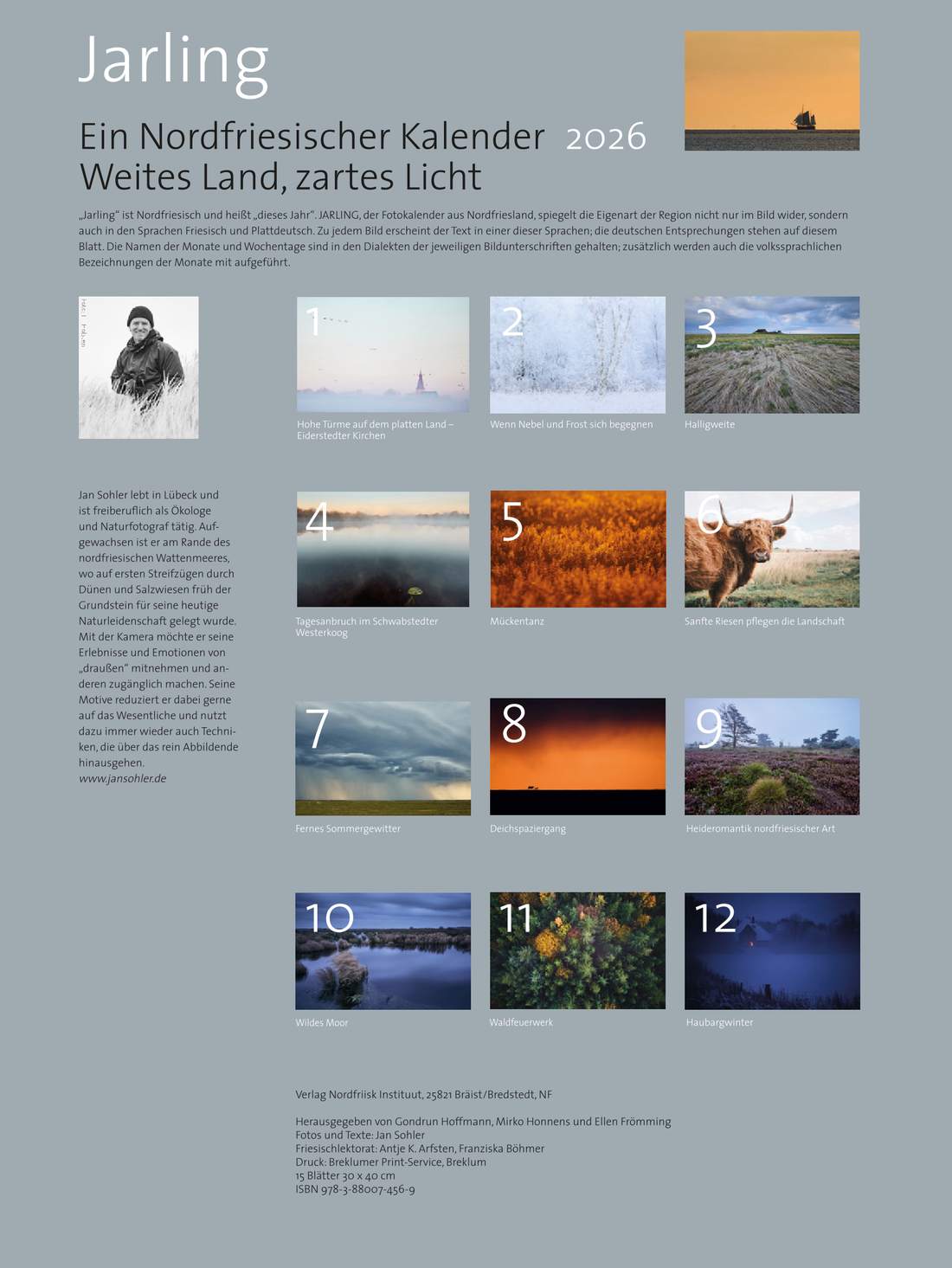 "Jarling" ist Nordfriesisch und heißt "dieses Jahr". JARLING, der Fotokalender aus Nordfriesland, spiegelt die Eigenart der Region nicht nur im Bild wider, sondern auch in den Sprachen Friesisch und Plattdeutsch. Auf jedem Bild stehen die Texte in einem anderen friesischen Dialekt oder Plattdeutsch. Die Monate und Wochentage sind in den Dialekten der jeweiligen Bildunterschriften gehalten; zusätzlich werden auch die volkssprachlichen Bezeichnungen der Monate mit aufgeführt.